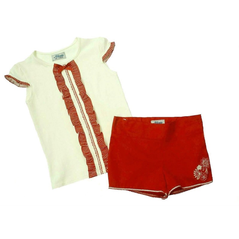 Coqueto conjunto compuesto de short en color rojo tejido canutillo con bordado de flores, cierre cremallera oculta lateral y cintura ajustable y camiseta en tejido algod¢n color marfil con detalles de entredos en rojo con topitos, de Nekenia